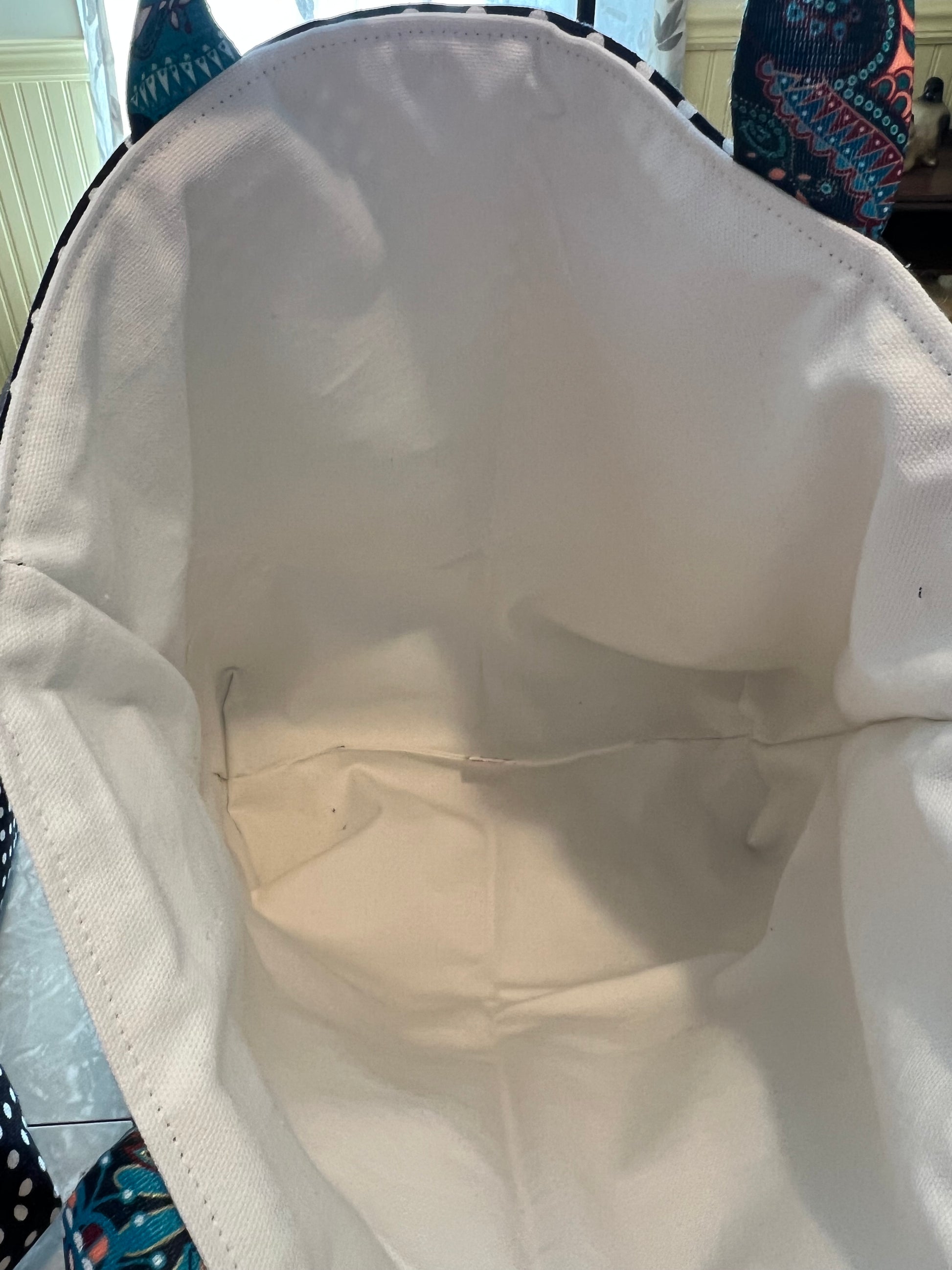 Polka Dot tote bag measures 16” wide by 15 1/2” tall.